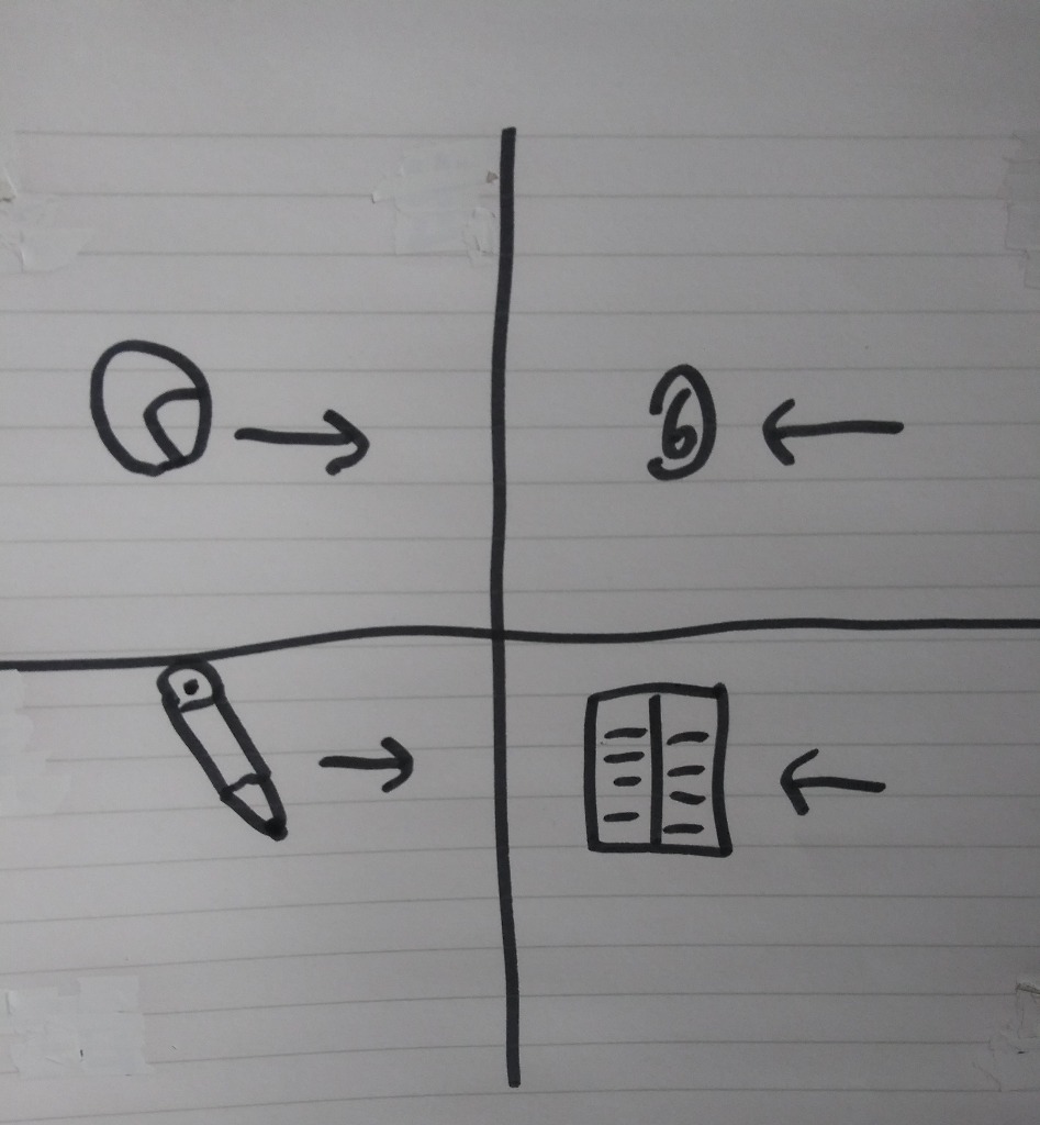 つまり、この四つの要素の中で一番難しいのは情報を早く出力する「話す」で、一番簡単なのはゆっくり入力する「読む」なのです。